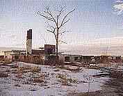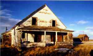 | Conquerville was once as thriving rural community in deep southeast Alberta, about 30 miles north of Highway 61 � which is now dotted with several ghost towns and communties facing extinction. Conquerville, situated in prime prairie agriculture land, was located at the intersection of two gravel paved roads. The high school was the heart of the community but old-timers say too few kids were coming and had to be closed in the 1980s. The school later burned down and today only charred ruins remain. The basketball court outside is now being overgrown with weeds. Scattered in the area are abandoned farm and commercial buildings, including one that used to be a gas station and store. There are a few residents nearby and a community hall. But the farming community essentially when the school closed. Submitted by: Johnnie Bachusky |