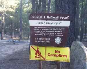| Bradshaw City's post office was established July 1, 1874 and discontinued December 15, 1884. Some believe Bradshaw City eventually became the current town of Crown King, located a few miles up the road. At one time there was said to be over 5000 people living in Bradshaw City. The Tiger silver mine was the mainstay of Bradshaw City, and was one of the most productive mines in the area. Harsh conditions in the area prevented miners from working the winter season, and the mine was closed for the year more than once after men fell to their deaths while being lowered into the mine by a drunk hoist operator. Bradshaw city had stores, saloons, restaurants, and even two hotels. Today nothing remains but a forest service sign. | ![]() Bradshaw City Today |