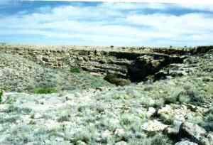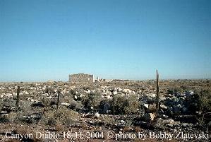Not well known, but Canyon Diablo is suppose to have been even wilder and more wicked than Tombstone. This originated as a railroad town in 1880 that sprang up where construction of the railroad had halted until a bridge could be built over the canyon. There was a delay due to finances. It was not until 1890 that the rail bridge was completed. No law existed here since the nearest law enforcement was over 100 miles away and the robbers and cutthroats had their way. It is said that any drifters either moved on or ended up in the cemetary. The saloons, gambling houses and brothels ran 24 hours a day never closing. Once the railroad bridge was built over the canyon, the town soon died. Submitted by Tom McCurnin. I recently read through "Two Guns, Arizona" by Gladwell Richardson (1968), and found that there was quite a bit of information on the original town of Canyon Diablo... I thought it may prove interesting for the page if you cared to use it. The pictures on the site are the ruins of a trading post, from after the original town had disappeared. The one of mine is a cistern north of the trading post. >From the book: "It was a shack town. Two lines of buildings faced each other across the rocky road on the north line of the right-of-way. They extended east one mile from the yellow-painted depot. It was the railhead for Flagstaff, Prescott, and other towns west and south...a regular stage line also operated between Flagstaff and Canyon Diablo."Along Hell Street stood fourteen saloons, ten gambling dens (or poker flats), four houses of ill-repute and two dance pavilions which were hardly more than houses of ill-repute themselves. None of the shacks were substantial buildings, being green lumber frames covered with tin, tar paper, and canvas. Wedged between these places were eating counters, and a grocery and dry goods store. Few had a name lettered on their drab, unpainted false fronts."The houses of prostitution were untitled. The favorites were owned by Clabberfoot Annie and B.S. Mary (the initials stand for what you think they do)...their competetive places faced each other across the dusty, stony road..." The book goes on to describe the boothill cemetery where 35 graves could once be seen - the wooden markers & fences now gone, and the few that were covered with stone now indiscernible. The only grave left is of Herman Wolf, a trader who passed away in 1899 - and the only person buried there to have died peacefully. The majority of the graves (unmarked & mass) could be found north and south of the tracks, as well as along the eastern edge of the canyon. Of the six peace officers that existed there, not one of them lived longer than a month in the position; the first put on his badge at 3 pm, was laid out for burial at 8 pm. The army was eventually requested to take over law enforcement, but before they arrived, the bridge was completed and the town dried up. Essentially, there is nothing left of the old town of 2,000 people - which was bigger than Flagstaff at the time - and today, only the trading post, the grave of Herman Wolf, and the spot which I believe is the Canyon Diablo station can be seen. . Joe Grumbo