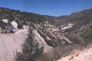 About 3.5 miles off SR 60. REMAINS: Six mining buildings still standing, one modern building. Very large tailings pile, many mines. |