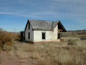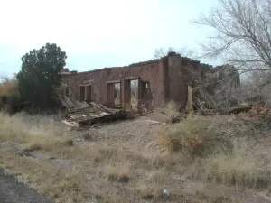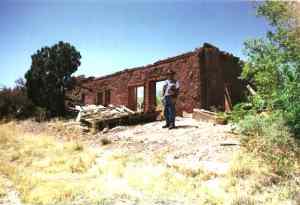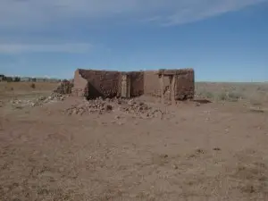 of AZ 61 and 180A. About 50 miles southeast of Holbrook. REMAINS: Numerous adobe buldings, some in unusually good shape, of a late 19th century farming community. |