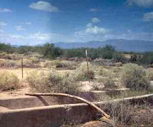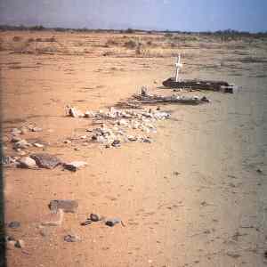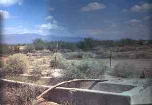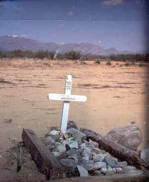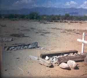 UPDATE: To Whom It May Concern: To get to the Well via Highway US 60 ..........per your directions go 1/2 mile West of Gladden and head North 2.9 miles. The 2.9 miles is ok but the road is located at mile post 71.3 (71.3 miles East of the state border with California) and this about 4 + miles W. of Gladden! All Arizona State and Federal Road are marked with mile post signs every mile starting with #1 on the Western Border and #1 at the Southern Border, they increase by increments of one for each additional mile (yes and some driver run over them so a few may be missing here and there! (Increasing from West to East and South to North) The road is almost washed out from recent severe flooding off the Centennial Wash just North of the Grave sites and Well. A high clearance 2 wd could make it but I couldn't get there in my family car last Sat. The Well site is actually in La Paz County, Az and not in Maricopa County as per your map and site marker on it! When the well was built, it was in Yuma County, AZ. Yuma County split in half creating La Paz for the Northern half or so. Your basic information was enough for me to find the well anyway because my past experience with Ghost Town locations is that ........they are usually wrong to varying degrees. The well cement chunks that were bulldozed into it are not in sight! They must have sunk in the mud from the water of the recent floods (2 of them) and hole is an estimated 8-10 feet deep and about 10 feet across with stretch cracks around the periphery that more is about to cave in .....(these cracks in the earth are outside the fence that was built around the well itself). Amazingly the floods, did not bother the graves but we could only find 5 of them including the one you picture with the cross on Cullen's Grave. A friend that lives in Wenden, Az about 10 miles West of the site told me Saturday that there were originally a bunch of cavalry soldiers burried there also! I could not find any evidence to support this but there obviously was much more there in the 1800's than just a stage stop and a well. (judging by previously cut wood planks, posts etc and nails all over the place with the rusted tin cans etc) For Your Information John Kerr. UPDATE: To Whom It May Concern: Today I went to the Cullen's Well area only to be greeted by a Bureau of Land Management sign which has declared the area off limits to excavating (metal detecting & digging) and claiming it an "Arhaeological Site." The sign also warns that the area is being "Monitored!" For Your Information To Would Be Metal Detectorists wanting to hunt therein. John Kerr To Whom It May Concern: Hopefully there is a photo attached of Cullen's Well taken in early 2001. There was a disasterous flood in the area in Dec 2000 that apparently caved in the remains of the cement pieces shown in your photo. There was flood evidence for over a mile away from the Centennial Wash in the area and that wash resulted in fatal injuries at Wenden plus damages in he towns of Wenden, parts of Salome and some lesser towns way Southwards of Salome. Sincerely John |
