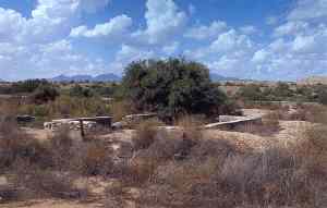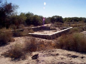 of I-10 along S.R. 1:Located on C.R.I.T tribal lands. REMAINS: One well, the foundations of one stone structure (repaired) and many small hillocks of adobe material.Fenced, entry not encouraged. |