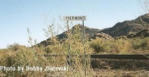 | Piedmont was located between Weawer Mountains and Date Creek Mountains on Date Creek Road (Yavapai Route 62) between Hilside and Congress. I don’t know something about the place, but here is the picture – that’s only what’s left of the town - only the sign beside Atchison Topeka & Santa Fe Railroad. I hope you know something about this place. Regards from |