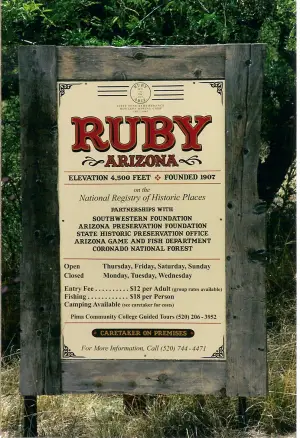 NAME: Ruby COUNTY: Santa Cruz ROADS: 2WD LEGAL INFO: T23SN, R11E CLIMATE: Mild winter, warm summer BEST TIME TO VISIT: Anytime |