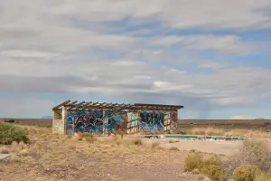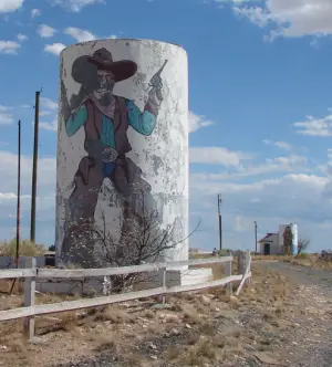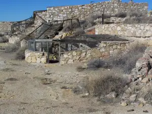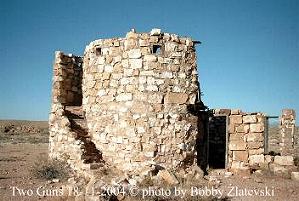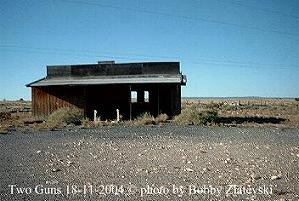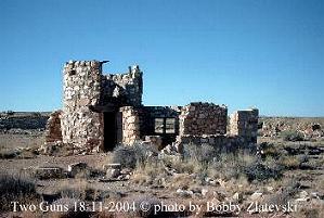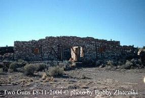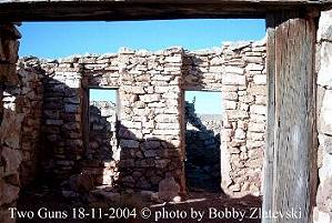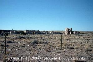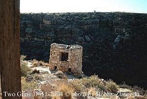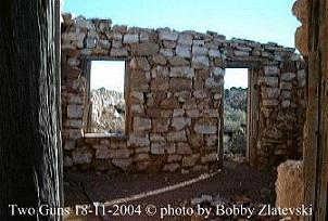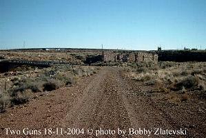 - has its own exit. UPDATE: Hello! I just spent a couple of hours in Two Guns, Arizona and wanted to send you an update. The site is completely abandoned; no caretaker, no nobody. The barbed-wire fences have open gates so all of the old and newer buildings are accessible. Tons of graffiti on the newer (20th century) buildings and lots of heavy vandalism. The old stone buildings are intact and, from what I saw, unmolested. I loved the place: no safety railings, no park rangers, no concession stand, etc. - John R. S. |