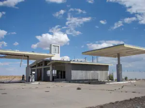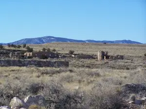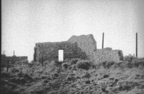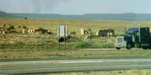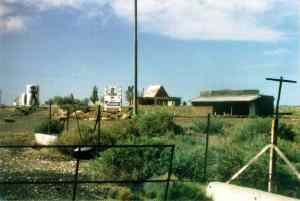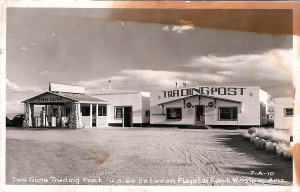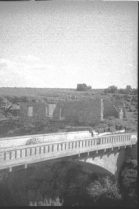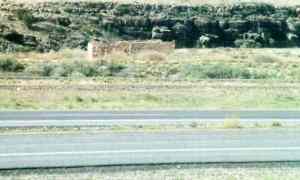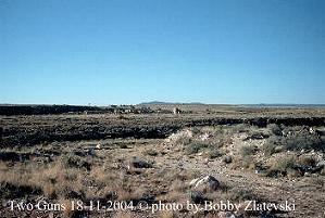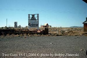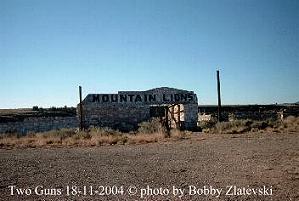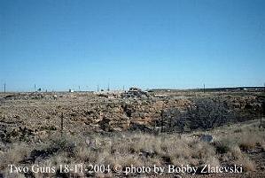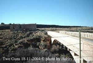 Two Guns was, in the past, the site of a major confrontation between the Navajos and the Apaches in the 19th century. Its modern history begins when the site is recognized as an easy place to cross Canyon Diablo--first, by wagon, and then later by motor cars. It was originally called "Canyon Lodge" when the National Trail Highway moved westward; when the Trail was re-named Route 66, the site's name was changed to Two Guns, because the proprietor of the facilities located there was one Henry E. Miller, who called himself "Two Gun Miller" (for reasons unknown). During the heyday of Route 66, Two Guns became one of the numerous tourist traps along the way, with a gas station, overnighting accommodations, a food emporium, etc., as well as the zoo (signs of which are still visible from the Interstate). Two Guns went into decline with the building of Interstate 40; although numerous resuscitations have been attempted (including by the owner of The Main Event, in Quartzsite), it is today fenced off and not accessible to the general public. (There is a caretaker who is quite vociferous about keeping people away in order to make certain that what is left is not vandalized or stolen.) Remains: The old bridge across Canyon Diablo which was a part of the National Trail and Route 66 is still standing; there are also numerous ruins associated with the zoo, as well as the remnants of buildings associated with various eras of Two Guns's past. There are also the abandoned (modern) gas station and the camp grounds buildings, both visible from the Interstate. Lettery from Unke Perry who used to live at Two Guns describing the site: Dear Irene, I was happy to get a letter from you and that you and Mildred are ok and doing fine. Irene, I tried to draw you a diagram, maybe it will give you some sort of an idea of the lay of the land around Uncle Bill's old horse camp. As Cap showed me the place Cap worked for Uncle Bill for quite some time I think. He had a lot of funny tails to tell me about he and Uncle Bill. Now this old house is a rockhouse part of it has fell down there was the front room still standing when we were there. Cap pointed out to me where the trail leads out to for them to get a bucket of water. They had to go clear down to the bottom of Canyon Diablo to get a bucket of water you will see the little draw or canyon like leading down near the cabon to the north east. Now this was only the old horse ranch. The main ranch was somwhere over on the Little Colorado River. I wouldnt have any idea where it was only Cap said it was about 50 miles from the ranch to Holbrook. It would be west of Holbrook. Now all that country around the old horse ranch and around the old meter crater country and on south to the rim of the Mogolon Mountains was uncle Bill's cow range. And of course north to the Little Colorado River. He sure had a large range. Uncle Bill told me that the country around there used to be the best grass country in the world for cattle. Grammer and Buffalo grass. Cattle was always fat. Now the main ranch over on the Little Colorado River was where Grandpa Roden lived and raised up his children there and when Grandpa Roden died he left the ranch and horses to Uncle Bill and the cattle was to be devided up between the girls so Uncle Bill established the range around where his old horse camp was as his own range and he branded his cattle and horses pitchfork and the girls all had a brand of their own. My mother's cattle was branded APL I dont know what the other girls branded theirs. When my dad and mother were married they sold the APL cattle to my Uncle Charlie Chapman and my dad and mom went to Oklahoma for a while took up a claim and bought some more cattle that was branded (cross ell) We later drove them west as you all know . Drove them to Santa Rosa New Mex then later on to Arizona. Well thats about all there is to it Irene except when my mom saw that she had some cattle to look after she decited she needed a cowboy. So my dad was a young gay cowboy and he was the boss of the West End range for the Hash Knife Cattle Co. Headquarters Ranch at Holbrook. So one night at a dance in Holbrook my mom spied that gay young cavallero boss of the Hash Knife Cattle Co. range so she set her cap for him and he fell like a ton of brick. That was my lucky day or else I wouldnt be here now. Well Irene I will have to go now. I will say by by for now give my love to mildred and I cincerialy do wish for you and Mildred the very best of good health and many many good blessings With Love, Unke Perry. I was reading your info on Two Guns and would like to add a few things. First, I was first there around 1978. Back then there was a campground there. I camped out for two nights. The owner at the time was kind enough to tell me some stories about the place. He told a story about how a group of Cavalry soldiers were attacked by Indians there. They were out numbered and with no where to run they holdup in a small cave there. They had to shoot their horses and stack them in front of the cave for protection. They held off the attack for three days until help arrived to rescue them. Well, I at first I thought it was just a tall tail, but he said if we look had we could evidence of the battle. He was right I found the cave and looked around the area. I found 6 or 7 arrow heads, a few Indian beads, a few brass Cavalry uniform buttons, and numerous bullets. He also told me about an old trading post a few miles east of there witch I found the next day and picked up a few more arrow heads. It was a great time. In 1999 my wife and I went back to find the place all fenced off. Thanks Fred Blockland