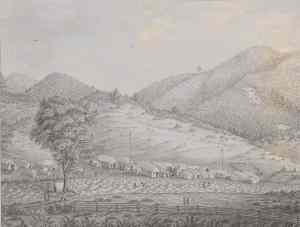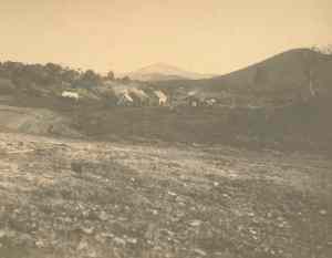 | Agua Fria, today a true ghost town, was principally a placer mining camp divided into Lower Agua Fria and Upper Agua Fria. The name was derived from two springs of cold water about a quarter mile below Lower Agua Fria (the principal town). It may have been there that John C. Fremont's men discovered gold in 1849. In 1850 it was a booming trade center and final destination for many new arrivals in California. It was there, too, that James Burney, first county sheriff had established a log cabin which served as a jail of sorts. Burney also recruited men in Agua Fria for pursuit of the natives during the Mariposa Indian War, in 1850. It was Mariposa County's first Seat of Justice from February 18, 1850 to November 10, 1851. A post office was established October 7, 1851. In 1853 a 6-stamp quartz mill was established in Upper Agua Fria. The camp boasted a hotel, express office, assayers, billiard room, bowling alley, monte and faro banks, about a dozen stores, numerous tents and log cabins, and several houses of ill repute, by the Fall of 1850. Agua Fria, on the decline by the mid 1850s, suffered a succession of disasterous fires and was never rebuilt. While there is not much to see, you can take Agua Fria Road to Mount Bullion and the site of Princeton. It's also a nice alternate route into Mariposa. The site, today on private property, is Historic Landmark 518. Submitted by Joshua Reader. |