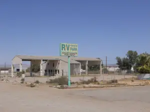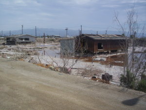 On the eastern shore of the Salton Sea, about 350 full-time residents. Shore-side of town was flooded in the 70's. REMAINS: A number of trailers, the hardware store. |