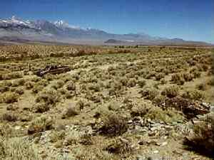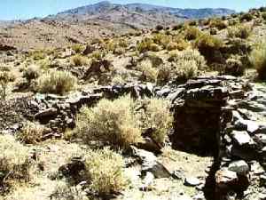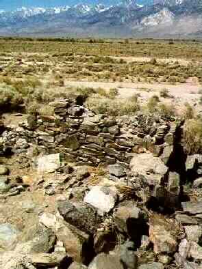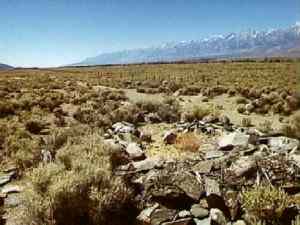 of San Carlos (1863) and Bend City (1863). Both were contenders for the county seat of still born Coso County and later Inyo County before abandonment. REMAINS: Several stone cabin walls, nearby improved mine tunnels,prospects and cuts. A mill site is found on the west side of the Owens River, but unaccessible by road. |