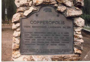 No need to explain how this town got its name. It served a useful purpose for the Union Army during the Civil War. It provided most of the metal needs for the Union Army during that war. Located out of Stockton, the copper lode was first discovered by two prospectors at about the same time in 1860. During the war years, Copperopolis had a population of 10,000, much larger then any of the nearby gold camps. At the end of the war, the price of copper dropped to 19 cents a pound compared to 55 cents during the war. This forced closure of many of the mines and population dwindled. It did, however, provide copper during the two world wars. Submitted by Henry Chenowith. Copperopolis, originally known as Copper Canyon was founded in 1860, at the site of the 2nd big discovery of copper ore in the area. William K. Reed, Dr. Allen Blatchly, and Thomas McCarty discovered a rich claim they later called the Union, and within 1 year, it was producing vast amounts of copper ore. Before long several other claims had been established, including the Keystone, Consolidated, Empire, Webster, Kentucky, and the the Calaveras. All located in the now famous Copper Canyon district, the claims, and the men they employed, together with the businesses needed to provide for the miners' needs, are what formed Copperopolis. On August 3, 1860, a mining district was organized, and mining laws adopted, allowing each miner to file 1 claim on a vein 150' in length and 300' wide. Any miner discovering a new claim was entitled by law to an extra claim of the same extent. The town grew rapidly, enjoying great prosperity between 1860 and 1867. The center of town, called "The Plaza" was located across from the Armory. From there, main street runs about 1 1/4 miles northwest to the end of town, parallelling the rich copper vein. During the copper boom, main street was lined with buildings of all shapes and sizes, offering the population just about anything they wanted. Many of the buildings were constructed of bricks hauled in from Columbia, where the buildings there were being torn down so the miners could mine the ground underneath. Copperopolis owed much of its prosperity to the Civil War, as huge amounts of copper were needed for shells and bullets. Getting the copper to the Union forces was a very difficult task. In 1863, William Reed built a toll road over which oxen teams hauled $1.6 million in copper ore that 1st year. The ore was taken to Stock-ton, shipped downriver to San Francisco, put on sailing ships and taken around Cape Horn, where they finally arrived at smelters in Boston, NY, and Philadelphia. Copper then became available for use by the Union Army. The war also generated lots of publicity for Calaveras County, as the region which also included Telegraph City, and Campo Seco, became the 2nd largest copper producing district under northern con-trol during the Civil War. By 1870, the population was down to 170, but during the 1880's, it sprang some-what back to life. A boston conglomerate bought the Union and Keystone mines, and they became active once again. The mines of Copperopolis continued to produce over the years, with boom periods occuring during the 2 World Wars. The Bureau of Mines credited the mines with 72,598,883 pounds of copper from 1861 to 1946, over $12 million worth of copper. Copperopolis may not have been a gold town, but it was definately a mining town. The mines, remaining buildings, cemeteries, etc., are interesting to wander around. The road going to Copperopolis from sr49 is a rather rough two-lane, with many curves and rolls in it, but if you have the time, it's a nice quiet setting worth exploring and photographing. submitted by bob stelow. |