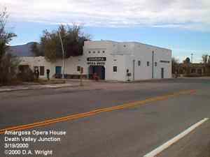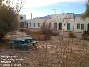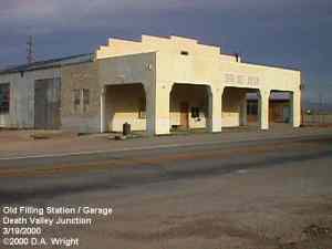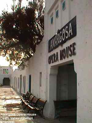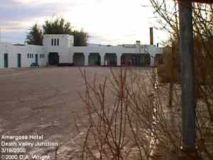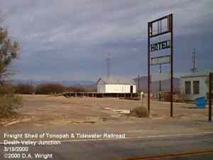 | Death Valley Junction was christened into being due to the construction of the Tonopah & Tidewater Railroad, then building north from Ludlow, CA, en route to grander plans by the Pacific Coast Borax Company to cash in on the Tonopah / Goldfield / Bullfrog booms to the north, and to service their own borax mines on the eastern fringes of Death Valley, near Greenwater. Death Valley Junction was just that: a junction of the Tonopah & Tidewater and a spur of the railroad to the company mines at Ryan. Death Valley Junction began life like most camps in the region: a tent town that appeared where there once were desert wastes only days before. A tent hotel, a tent saloon, a tent store and a few dwelling tents popped from the creosote and scrub on the edge of Ash Meadows. Death Valley Junction increased in size and prosperity around 1915 when new mines were found and the Death Valley Railroad was incorporated to build a line eastward to the site of New Ryan, on the very brink of Death Valley. Additional civic facilities were built and the town began to take on an air of permanence. Milling facilities for borax also added to the local economy, as well the town's location as a social center for the outlaying area. Pacific Coast Borax moved their mining activities in 1927 to a new mine closer to Los Angeles, but Death Valley Junction continued to thrive as a tourist destination. PCB constructed the facilities still used to this day - the popular and plus Furnace Creek Inn, and additional lodging at New Ryan. Tourism slowed down due to the Depression, although the creation of Death Valley National Monument in 1933 kept interest in Death Valley high. The Death Valley Railroad ceased operations shortly after the completion of mining at New Ryan, although the baby gauge railroad that ran from New Ryan into the extensive Widow Maker and Charley McCarthy Mines kept operating for the benefit of tourists until the late 1950's. In 1967, a new culture came to Death Valley Junction. That was the year that a New York ballet dancer, mime and artist had a flat tire in Death Valley. She's stayed there ever since. Marta Becket opened a theater of dance in the nearly abandoned hamlet, inside what was once the sprawling Amargosa Hotel, then in sad shape. She was tired of the stressful life of New York City and embraced the wide open spaces in which the tiny speck of Death Valley Junction sits. She is still dancing today. Those who have seen her dance marvel at her talent for both the art of dancing and the art that graces the walls and ceiling of her theater. At first glance, those traveling through Death Valley Junction won't see much, but the area has many fascinating buildings left over from its once proud position in this region. Fragments of the two railroads and their once large rail yards are still standing or can be seen. Submitted by: David A. Wright Great Basin Research |