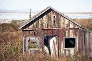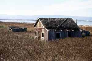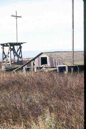 two miles north along the tracks. This is private property and trains still run on the tracks frequently. REMAINS: A few huts, most of them partly submerged in the San Francisco Bay |
