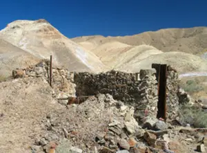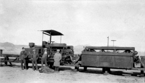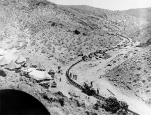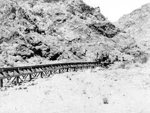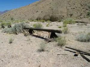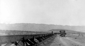 In 1917 a deposit of Epsom Salts was found near the old Wingate Wash Borax Road at the southern end of Death Valley. In 1919 the claims were acquired by Los Angeles florist Thomas Wright. Although close to an existing road, Wright devised other plans to exploit the find. A scheme to dissolve the salts and transport them via a 28-mile pipeline to the Trona railroad had to be abandoned due to the lack of water. In 1922 Wright began construction of a monorail at Magnesia siding on the Trona railroad, six miles South of the town of Trona. It ran Eastward across the south end of Searles Lake, through the Slate Range via Layton Canyon, across tip of Panamint Valley, over Wingate Pass and thence to the mine. It consisted of a single steel rail on the top of a heavy wooden beam supported by A-frame trestles about three feet high. Locomotives and cars ran on two wheels much like pack saddles on a mule's back. Construction took 2 years and a cost of $200,000. Simple in concept, the line never worked properly, and after several attempts to increase efficiency the operation ceased in 1927. In the late 1930's the rail and beam were salvaged, leaving only the A-frames, most of which have since disappeared.