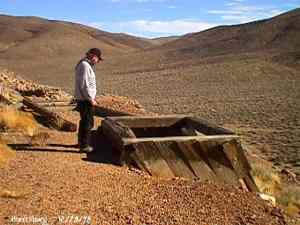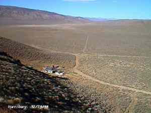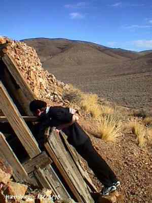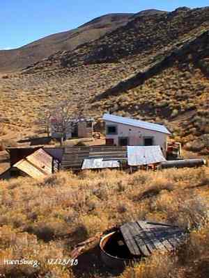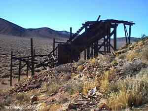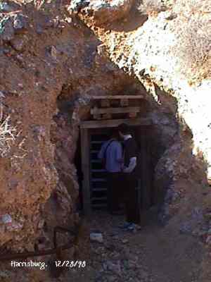 The Town is named after Death Valley miner Shorty Harris. He and friend Pete Auguereberry stake gold claims there in 1906, and very shortly a town was born. It grew to be home for several hundred other prospectors, but their homes were just tents. Within a few days of the original discovery, another claim started (which would soon become Skidoo), and everyone left. Auguereberry came back later and worked the mine for many years. The building still standing are the remains of his home. Submitted by Kurt Bayburt. ![]() Alan Patera inspects the shaft of the Cashier Mine. This mine was originally located by Shorty Harris. In later years it ended up being mined by Pete Aguereberry, who tapped into it through his adjoining Eureka Mine. December 28, 1998. Courtesy David A. Wright ![]() Richard Campbell peers into the hoisting works of one of the Cashier Mine portals. December 28, 1998. Courtesy David A. Wright ![]() Cashier Mill ruins. December 28, 1998. Courtesy David A. Wright ![]() Many scattered stone footings that once held tents are found through the Harrisburg townsite. Cashier Mill ruins dominate the background. December 28, 1998. Courtesy David A. Wright ![]() The Eureka Mine. The mine is safe enough that there are interpretive displays located inside the mine, accessible to a depth of about 300 feet. The Park Service keeps the mine closed to entrance through winter due to the hibernation habits of the Townsend Bat, which hibernates during the winter. If anyone would disturb the bat while hibernating, it could expend vital stored fats needed to keep it alive throughout winter hibernation while fleeing individuals that wander in. The mine used to have a heavy door frame, sign indicating the Eureka Mine, and wooden door up to about 1994, but has since been replaced by this one. WESTERN PLACES publisher Alan Patera and Richard Campbell explore the mine. December 28, 1998. Courtesy David A. Wright ![]() Ruins of the Cashier Mill, Harrisburg. This is located on the south side of Providence Ridge. View is southwest. Harrisburg townsite occupied the flat below the mill, comprised of primarily tent dwellings with wooden floors and subwalls. The Cashier Mill was a producer before closing down about 1911. December 28, 1998. Courtesy David A. Wright ![]() View north from the top of Providence Ridge across Harrisburg Flat. Pete Aguereberry's camp is below. The original road from Harrisburg to Skidoo runs across the valley, before turning east to run around the hills to the Skidoo townsite, about ten miles away by road. December 28, 1998. Courtesy David A. Wright |