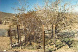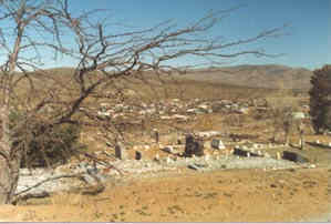 Today, the most striking evidence that Johannesburg was a prosperous turn-of-the-century mining town is the headframe of the King Solomon Mine (discovered in 1896) and the nearby town cemetery. No longer visible, however, are the Randsburg Railway tracks, which culminated in Johannesburg--making the town a booming transportation center for the region. Many surrounding mining communities--such as Randsburg, Ballerat and Skidoo--relied on the tracks to receive equipment and supplies, and to transport ore out of town for processing. When miners at Randsburg¹s Yellow Aster Mine constructed their own ore-crushing stamp mill (one of the largest ever made), the value of the railway greatly diminished. The line was sold to Santa Fe Railroad in 1903, and the tracks were eventually abandoned, then torn up sometime between 1933 and 1934. Johannesburg was a highly civilized family community, with streets planned out in an orderly arrangement, a working water system that extended to residences, a social organization whose clubhouse included a billiard table and piano...the town even boasted a nine-hole golf course. Among the town¹s buildings were boardinghouses, banks, churches, a post office, a music hall and two saloons--all occupied by a community of men, women and children who had little to do with the gambling, dance hall girls, and general rowdy living that¹s often associated with this era. For more detailed information, consult Ginny Clark¹s Guide to Highway 395 and/or Philip Varney¹s Southern California¹s Best Ghost Towns, both of which supplied the bulk of the above information. Submitted by: K. Allsbrook ![]() King Solomon Mine Courtesy Dolores Steele ![]() Johannesburg Cemetery Courtesy Dolores Steele |