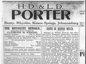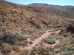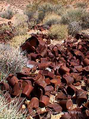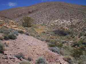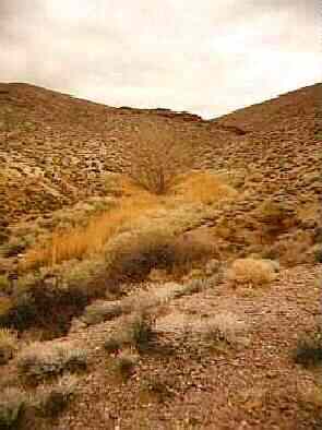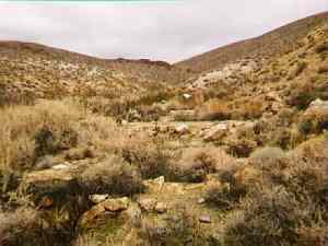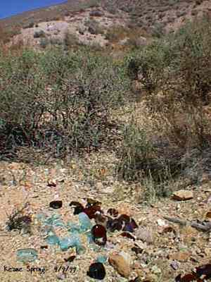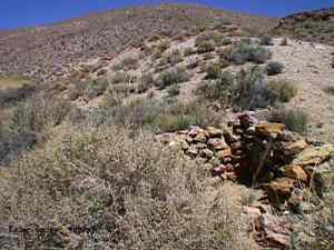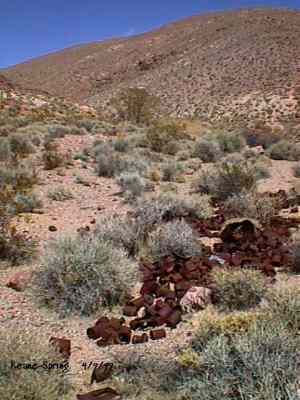 Keane Springs was located in the South Bullfrog Mining District. It was the only reliable water source in this area and served as a center of activity during the first decade of the 1900's. Water from the springs served the neighboring town of Chloride City and also for Keane Wonder Mine and mill, far below near the floor of Death Valley. The town of Keane Springs began early in 1906 and lots were sold by the Keane Springs Land Company for $25 to $100 each. The town consisted of primarily tents, though two wood frame buildings were reported to have been built. Businesses included the large tent of the Death Valley Merchantile Company, a branch of the Porter Brothers chain of merchandise stores, a couple of office tents, a boardinghouse, a saloon, corral and stable for the Kimball Brothers Stage Line from Rhyolite. A post office was approved, but rescinded. The remains of the town were destroyed by a flashflood in 1909. Submitted by: David A. Wright