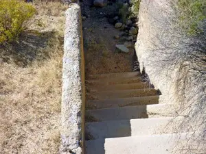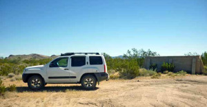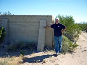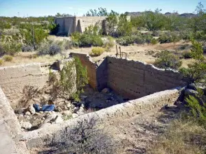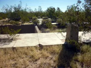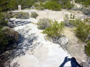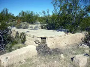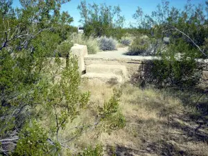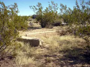 Hard to find. Levi, a resident of the valley since 1948, lives just north of Lanfair. He was a county sheriff for many years, and knows this area very well. He was kind enough to take us to a spring with a lot of petroglyphs on the rocks around it. Rock Springs Camp and Government Wells are close by. REMAINS: A few crumbling foundations. |