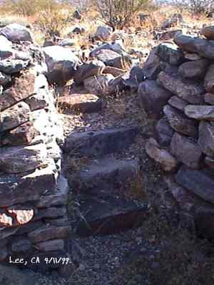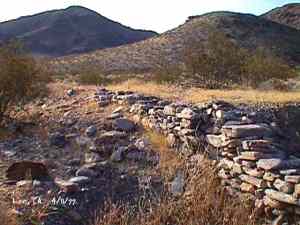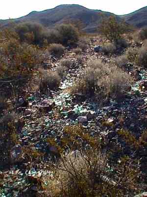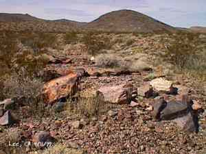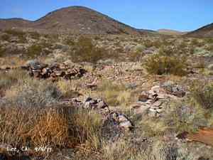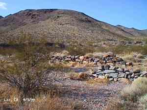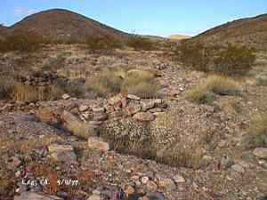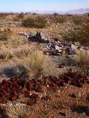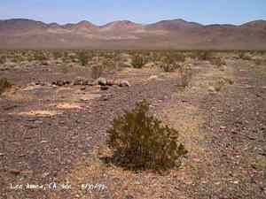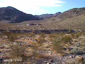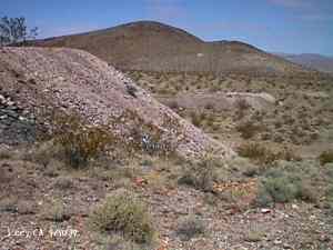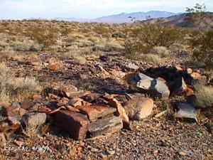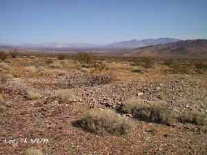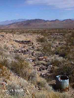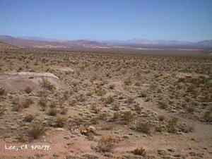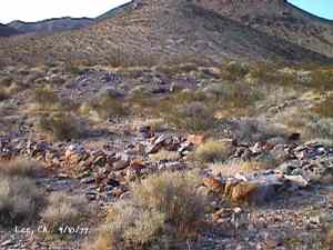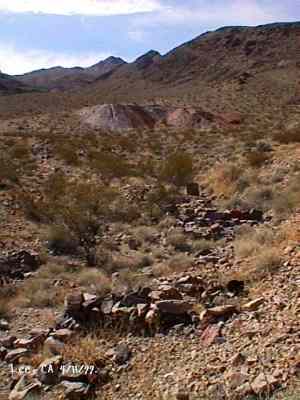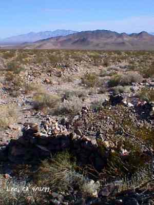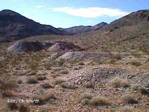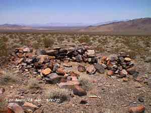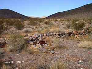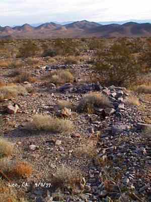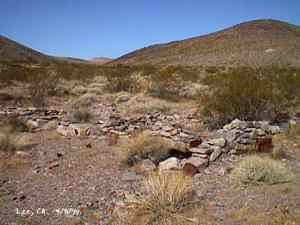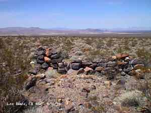 The wild Bullfrog in 1904 rush caused much prospecting to occur throughout southern Nevada and the Death Valley region of California. That year, brothers Richard and Gus Lee decided to try prospecting, leaving their ranch at Resting Spring. In November, with the help of Henry F. Finney, they found two gold ledges, which they named the Hayseed and the State Line, located at the eastern foot of the Funeral Range, 30 miles south of Rhyolite. These were located just inside the California state line, west of Amargosa Valley. A stampede began, and the Lee Mining District was formed in March 1905. The rush created the townsites of Lee, California and Lee, Nevada, each within sight of the other. In between, straddling the state line, was Lee Annex or sometimes referred to as North Addition. In May, 1905, the Lee brothers optioned the Hayseed Mine to W.F. Patrick, a Goldfield speculator, for the sum of $75,000, with $7,500 down. Patrick died two months later, and the mine returned to the Lee brothers, and they got to keep the cash. They decided that they could make some serious cash by optioning and re-optioning the Hayseed, but they soon found themselves and the mine wrapped up in litigation. The Lee boom reached its zenith in 1907, with a population of around 600 for the entire district. By February of that year, the fracas over the Hayseed was cleared and production began. Further zeal was added when the Tonopah & Tidewater Railroad, then under construction, passed within a few miles of the district and within sight on its way to Rhyolite. A townsite rivalry began, Lee, California becoming the biggest favorite. Of the 600 people in the district, Lee, California grabbed more than half. 300 men plus 20 women populated the townsite. There were many saloons and a red light district flourished in the location dutifully delineated by the Lee Board of Trade. Lee also had a post office (Lee, Nevada did not), which opened March 7, 1907 with John H. Lawrence as the first postmaster. A large union hall was erected by the Death Valley Miners Union, Local No. 258 of the Western Federation of Miners. The Lee Herald began publication October 15, 1907 by Earl Clemens to compliment his Rhyolite Herald and Skidoo News. A telephone line was run to the camp from Rhyolite. At first, auto and horse-drawn stages ran to the camp from Rhyolite, later to run six miles to and from Leeland Station on the Tonopah and Tidewater Railroad in the valley below. These stages connected with the two trains each day. Inyo County recognized the swelling population and appointed a justice of the peace, who also served as the tax collector. None of the towns in the Lee region had their own water. That had to be hauled in by Adolph Nevares from Rose Well at $5 a barrel. That price prompted most to travel to Rhyolite for their baths. The financial panic of 1907 caused dull times in 1908, leading to the eventual death of all the Lees. Lee, California hung on the longest. At the beginning of the year, the Hayseed shipped its first load of paydirt, 18 tons worth, brining in an income of $1,314. However, that load was also its last. Nothing less than $50 per ton ore could pay costs, even though the railroad was literally at the foot of Lee. Such ore was found only in small pockets that already had been exhausted, and so the superintendent closed down the Hayseed that summer. The Lee Herald suspended publication in February. By summer, there was only one saloon left. Not everyone left Lee. Enough miners and hangers on stuck around for a few more years, and William H. Lillard kept a store open until 1912. The post office kept its door open until April 1. Today, at Lee one can find an abundance of stone ruins scattered around a townsite about a third of a mile square, along with a nearly solid ground covering of cans and broken glass. There are countless stone cairns littering the region on both sides of the state line, empty mine tunnels and shafts are found on the floor of the canyon and on the hillsides. The largest tailings pile belong to Hayseed. In the site of Lee Annex, on the California side can be found a few stone foundations, the remains of a stone corral, glass and cans. The state line is marked on the main road to Lee and also the dim and seldom used road to Lee, Nevada. Stone cairns are found seemingly everywhere on both sides of the state line. Submitted by David A. Wright - Great Basin Research. Inyo Independent, March 2, 1906 �BIG MINING SUIT� An important suit has been commenced in the Superior Court of Inyo County, Cal., by Chas. del Bondio, the prominent attorney, against Richard and Gus Lee to enforce specific performance of a contract in writing to sell and convey the Hayseed and State Line mining claims in the Funeral Range, near the State line of California and Nevada and about 30 miles from the town of Beatty, and also to secure possession of said claims. These claims are well known, and are the same properties that were held under a bond for a large sum by Mr. Patrick at the time of his death. A very phenomenal showing of high grade milling ore is made for the amount of development. The samples taken from a quartz ledge give an average of over $150 for a width of seven feet. Out of 12 samples taken across this vein the lowest ran $110 and the highest $270. The property is only three miles from the surveyed line of the railroad and has abundance of water accessible for mining purposes. Col. Hugh Wilkinson of Rhyolite is the plaintiff�s attorney. -- Bullfrog Miner. David A. Wright Great Basin Research - Big Pine, CA