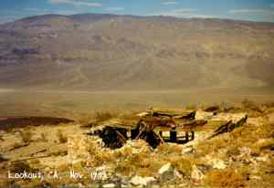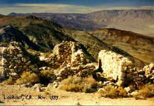 The camp of Lookout was founded in 1875. A pack trail connected it with the neighboring Modoc and Minnietta mines. The Modoc was owned by senator George Hearst, father of William Randolph Hurst. Submitted by Rob Julty. ![]() Lookout Courtesy Lewis Shorb ![]() Minietta Mine at Lookout Courtesy Lewis Shorb ![]() Minietta Mine at Lookout Courtesy Lewis Shorb ![]() Lookout townsite. A friend and his son walk through the main cluster of ruins. November 1989. Courtesy David A. Wright ![]() Ruins at the peak of Lookout Mountain. November 1989. Courtesy David A. Wright ![]() Lookout townsite. November 1989. Courtesy David A. Wright ![]() Lookout townsite overlooking Panamint Valley. November 1989. Courtesy David A. Wright
