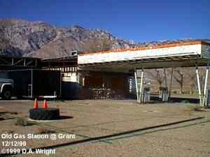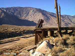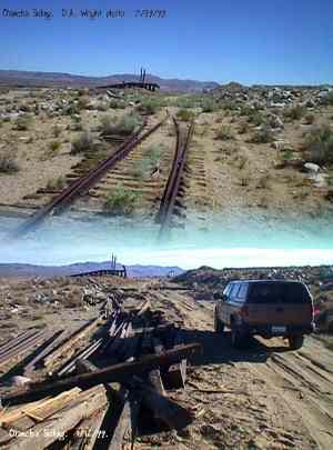 Olancha was inhabited by Indians living among the verdant meadows on the southwest shore of Owens Lake before 1863. That year, Minnard Farley constructed his mill on Olancha Creek. Farley came east of the Sierra Nevada Range in 1860 in search of the legendary "Lost Gunsight Lode", popularized a decade earlier when an emigrant crossing Death Valley lost his gunsite and replaced it with some local soft metal he found, which later proved to be rich silver. Farley didn't find the "Lost Gunsight," but he did find some rich silver mines in the nearby Coso Range. By December 1863, Farley had built an eight stamp mill with five amalgamating pans, a sawmill and a blacksmith shop. Indian uprisings later in the decade culminated with the burning of Farley's mill in 1867. By then, nearby Cerro Gordo began glowing brightly in the nearby Inyo Range, attracting stages to run north from Los Angeles, then a small burg 175 miles south. Olancha became a stage stop. Two steamships were constructed to carry payloads of Cerro Gordo silver bullion across Owens Lake, which tied up at Cartago Landing, a couple of miles north of Olancha. Soon Olancha was bustling with traffic inbound and outbound from Cerro Gordo. A post office was opened at Olancha September 23, 1870 and has remained open ever since. After mining died down, Olancha remained as an agricultural center. Many ranches raised livestock and produce, watered by abundant streams and springs. Ranchers have for more than a century have driven cattle and sheep into the Sierra Nevada Range and nearby Monache Meadows for summer range for their cattle, and large cattle drives still are the norm today. In 1910, the Southern Pacific Railroad reached Olancha with their Owens Valley Branch (the "Jawbone", which is now undergoing salvage), built to provide construction materials for the under construction Los Angeles Aqueduct, a 250 mile long aqueduct to feed pure Sierra snowmelt to the growing city, and is still in use today. Olancha continues to hold a stable population of around 200 citizens. A couple of restaraunts serve hungry tourists traveling along US395, along with a couple of gas stations. A large water bottling plant is located a mile north, serving the popular Crystal Geyser brand bottled water. Anheiser-Busch Brewing Company also owns property and pumps pure well water for use by their bottling plant in Los Angeles. Nearby attractions include: Olancha Sand Dunes, the Sierra Nevada streams and backcountry meadows, Dirty Sock Hot Spring, Cerro Gordo ghost town, and Death Valley can be accessed via Olancha. Today, decaying and abandoned old buildings are sagging and crumbling among occupied and cared for homes. The stone walls of Farley's Mill hide nearby with occupied homes a stone throw away. Salvage crews are presently scrapping the old "Jawbone" branch of the Southern Pacific Railroad, it has officially been abandoned in 1982 and salvage has finally begun. Submitted by: David A. Wright Grant was once a small community 1� miles south of Olancha. A market, gas station and hotel once served weary travelers plying US395 to or from the Eastern Sierra and its recreational opportunities. Pack trips could be taken from trailhead points west of the community into the headwaters of the Kern River on the west side of the Sierra crest. A few old buildings serve as a reminder that Grant once existed, but you�ll only see reference to it on older maps. The Highway Department removed the highway sign indicating Grant within the past decade. - David A. Wright. Olancha Siding, before and after salvage. Top photo taken July 1998, bottom taken January 1999 Courtesy David A. Wright