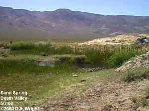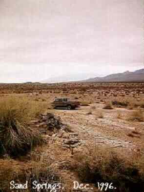 Sand Spring is located in the extreme northern end of Death Valley, located at an elevation of about 3,500 feet, and surrounded on three sides by higher mountains. The spring has always served as a watering hole for human and animal inhabitants. The spring was noted by explorer John C. Fremont, who camped there April 28, 1844, and proclaimed it "a very poor camping place." During the 1920's, Sand Spring served as a site of a water supply, gas station and store. The short lived "Skookum rush" was taking place in the nearby mountains. Today, the site contains a stone foundation from the store/gas station period, and the polluted well. This portion of Death Valley National Park is open cattle range, usually the visitor will share the site with one or two members of the bovine community, who usually snort their displeasure regarding your company. They are about the only company you'll usually have, as this end of Death Valley is far north of that populated by throngs of winter tourists. Submitted by David A. Wright, Great Basin Research.