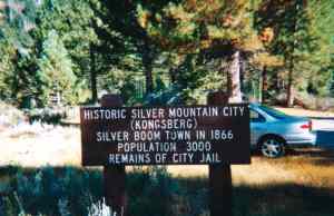 | Originally called "Kongsberg". Founded in the late 1850's-early 1860's by Scandinavian miners prospecting for silver. By 1863, the name was changed to Silver Mountain City. By 1866, the town had a population of 3,000. It was the county seat of Alpine County from 1864 to 1875. The demonetization of silver in 1873 caused its decline. Silver Mountain City was pretty much abandoned by 1886. Submitted by: Tim Blomgren |