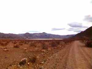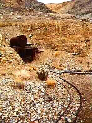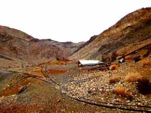 The Ubehebe Mine was discovered in 1875, but received little interest as the area was too remote. Due to application of electricity for domestic use, copper became a sought after commodity and the price of the element soared. In 1906, Jack Salsberry, who name is also placed on other landmarks in Death Valley, purchased the mine and founded a townsite nearby called Salina City. Salina City was situated upon the wide Racetrack Valley, whereas the Ubehebe Mine was found a short distance away at the head of a cramped canyon emptying into the Saline Valley. The townsite at its peak consisted of twenty tents, two saloons, a company store, a Kimball Brothers Stage station and a feed lot for Kimball Brothers. A post office was applied for, but never fulfilled. Salsberry also plotted the course of a railroad to run east across northern Death Valley, up Grapevine Canyon (where Scotty's Castle is situated) and to meet with the Las Vegas & Tonopah Railroad tracks at Bonnie Claire. The Bonnie Claire & Ubehebe Railroad was incorporated and the line partly constructed, but mine results proved too small to uphold the activity and the whole venture soon abandoned in 1908. The railroad grade became the present Racetrack Valley Road from Ubehebe Crater in northern Death Valley. The Ubehebe Mine also produced much lead and zinc, last producing in 1951. Submitted by David A. Wright ![]() The site of Salina City (also referred to as Latimer, near the Ubehebe Mine in the Racetrack Valley. The famous Racetrack Dry Lake, with its mysterious "sliding stones" is in the background. Courtesy David A. Wright ![]() Another mine portal at Ubehebe Mine. December 1996. Courtesy David A. Wright |