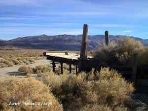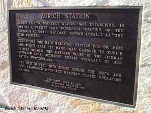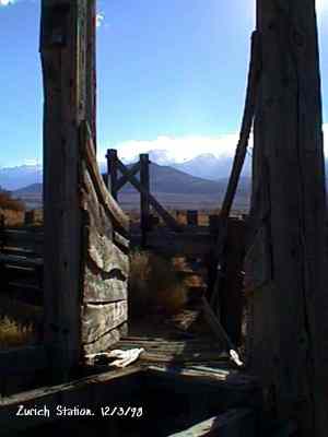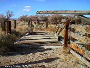 Montgomery ![]() Zurich's historical plaque located on California Highway 168. December 5, 1998. Courtesy David A. Wright Great Basin Research ![]() Stock yard at Zurich. This platform appears to be a scale for weighing livestock. December 5, 1998. Courtesy David A. Wright Great Basin Research ![]() Stock ramp. View toward Sierra Nevada after a late autumn snowstorm. December 5, 1998. Courtesy David A. Wright Great Basin Research |