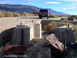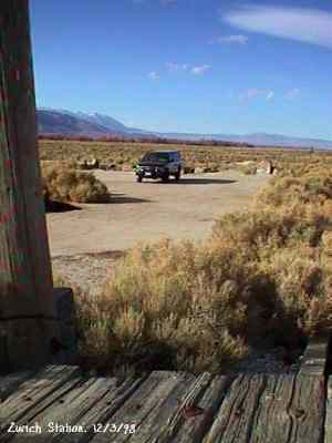 ![]() Zurich Station on the former narrow gauge Carson & Colorado Railroad. December 3, 1998. Courtesy David A. Wright Great Basin Research ![]() My truck is parked on the foundation of the depot, giving an indication of its size. December 5, 1998. Courtesy David A. Wright Great Basin Research