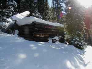 | Perhaps the only town to be named after a minister of the gospel, this town was named after a Father Dyer, an intrepid character who carried the gospel to remote pockets of the area. In an effort to help finance his mission in life, Father Dyer discovered the Warriors Mark mine, built a cabin a short distance from the mine, worked the mine for a year or two and sold it for $2,000. A mill was erected in 1883 and a spur on the Denver, South Park and Pacific Railroad was run in to haul out the ore. The mine was worked until 1908. During the early 1880s, others came to the area to try their luck, cabins were built and a small town named Dyersville was born. There are still ten or twelve cabins left in the town but none match the description of Father Dyer's original cabin. The site is not difficult to reach but the last half-mile is better suited to a 4-wheel drive vehicle. The railroad spur has been converted to an automobile road, and there is a U.S. Forest Service sign reading "Indiana Creek, Pennsylvania Creed," and pointing down in the Gulch. This leads to Dyersville.Submitted by Henry Chenoweth. | ![]() Dyersville Cabin Courtesy Susan Hobbie |
