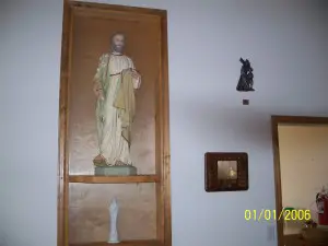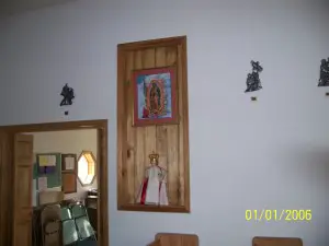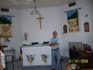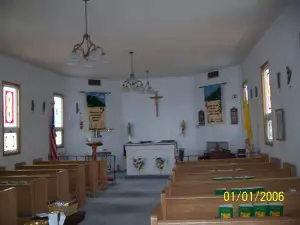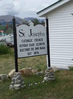 Prunes, the burro. One group of "get rich quick" miners, not at all happy with their findings along the eastern fringe of the Rockies, decided to look elsewhere. They found a stream not far from the South Platte River that offered good possibilities. Deciding to stay, they named the town Tarryall. News leaked out and others came to try their luck. They were met with firm resistance and told to keep on going "or else." Keep on going they did. One group of would be residents found a rich deposit of gold at the South Platte itself and named their town Fairplay. The new town had its ups and downs and still survives as one of the few that did. Fairplay is on highway 285, southwest of Denver. Submitted by Henry Chenoweth. Saint Joseph’s Catholic Mission The Church is still standing today and is actively used. It currently seats 64 people and there are plans to build a new Church for the growing Catholic community. Father Steve Parlet currently serves here. Rumor has it that this Church may be haunted by those original parishioners. This Church will always be maintained once the new Church is opened it will be converted to a Parish Hall which will be revered for its historical impacts on the community. ![]() Kitchen Courtesy Dolores Steele ![]() School Courtesy Dolores Steele ![]() Bank & Post Office Courtesy Dolores Steele ![]() Milk house Courtesy Dolores Steele ![]() Drug Store Courtesy Dolores Steele
