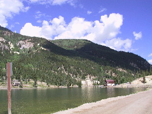 | The Golden Fleece and the Michigan mine were worked here. There are now summer cabins strewn amongst the ruins right on the shores of Lake San Cristobal Submitted by: Ghosttowns.com | ![]() Lake Shore July 2001 Todd Underwood |