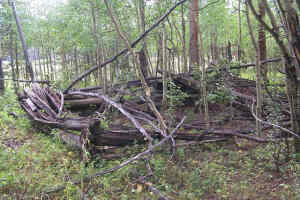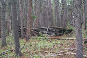 This 'ghost' town is actually said to be haunted. Big game hunters who have camped here in the fall have reported to have heard 'strange' sounds in the night. Voice and the sounds of picks and shovels working the ground were the common noises to have been reported. Some hunters have even broken camp and moved to another area. REMAINS: Old foundations and log walls of over a dozen cabins. |