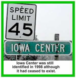 | Once called Goshen. It was laid out in 1855 and reached its peak in about 1881. It's demise started when the railroad went through 3 miles south. A new town, Maxwell, was started and Iowa Center's buildings were moved to Maxwell. There are still signs for "Iowa Center" on S27 north of Maxwell. Submitted by: Jerry Hale | ![]() Iowa Center Courtesy Jerry Hale |