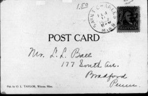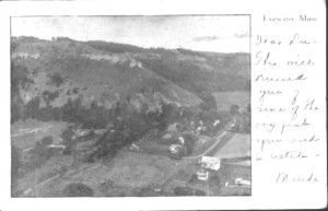 | I have a postcard sent in February of 1907 from Fairwater but postmarked in Saint Charles, Mn. Supposing either the photographer and/or the pilot knew where they were taking this picture, it shows a small community. Using the picture as though it was North/South oriented, it shows the road coming into town and taking a 90 degree turn to the right, continuing till it crosses a small stream, then turns 90 degrees left and continues along this same stream. The iron bridge is clearly seen, along with the barns and houses at the foot of a large bluff, from the previous orientation, we'll call it to the NW of the town. Postcard from Maude to 'Dear Lu, This will remind you of some of the big fish you used to catch'(?), sent to Mr. L.L.Ball, 177 South Ave., Bradfor, Pa (I'm assuming on the Pa, view the back of the card and see if you can read it any better!) Submitted by: Marina Cole |