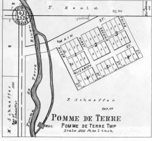 | The village of Pomme de Terre, was located along the old stage route from St. Cloud to Fort Abercrombie. The village was laid out by Timothy Heald in 1868, platted in 1874, and was the first village in Grant County. In 1873, Fred Williams and man named Schaeffer built a grist mill on the Pomme de Terre River near a small bodyof water, which has for many years been known as the Mill Pond. Thereafter, the town was off to a good start with a Post Office (1868-1902), two General Stores, one of which was a two story, two BlacksmithsShops, an Elevator, which burned in 1887, a Hotel and Saloon, Schoolhouse and of course, the Grist Mill. In 1873 an attempt was made to make Pomme de Terre the county seat, but it failed. After such a good start, however, the railroad did not come, running some distance to the north. All that remains today is the Schoolhouse, which is now the Pomme de Terre Township Hall and a small cemetery (Pomme de Terre Riverside).The village was named after the lake to the South. It is received from the early French voyageurs and traders, meaning literally apple of the earth, that is, a potato, but it was here applied to the edible ovoid-shaped root of the wild turnip (Psoralea esculenta), called Tipsinah by the Dakota Indians. During my research of this ghost town, I was delighted to learn that I had spent many a warm Summer's day around the old schoolhouse and village site.You see, the ghost town of Pomme de Terre was located on my uncle's farm. Many thanks to Patty Benson of the Grant County Historical Society for her assistance. Submitted by: Duane V. Peterson |