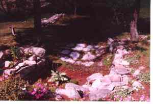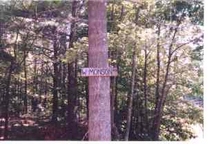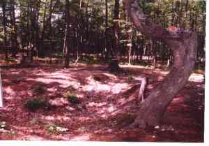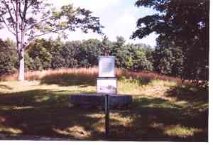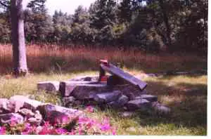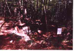 see. REMAINS: There is one restored colonial house, the "Gauld" house. Here there are some maps to the abandoned town. I think there is a museum inside this building, but we were there on a Sunday and no one was around. At this house there is an operational antique well pump. There are half a dozen colonial cellar holes. Each one has a posted sign with the history of the occupants. There is also a small graveyard next to one of the cellar holes. At the far corner of the area is a stone marking the "town center." . |