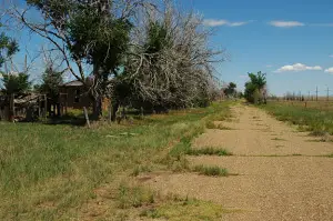 | Colmor has little known history. The name is derived from the two counties it is closest to (Colfax and Mora counties "COL-MOR"). Mostly a ranching community it also depended on the railroad which went through town, and still does. There is a creek and plenty of ranch land. Colmor is situated on the beginning of the "Great Plains." Just to the west of the town is the great Rocky Mountains. There were at the height of Colmor 450 residents. The last one of which died just over a year ago. A dozen intact houses line the main street and there are a few around the hills to the east of town. One gas station, with pumps still ready to be used and the school house consists of the main part of town. The train depot sits east across the tracks. Over-grown trees and cattle now claim the area. The town seemed to have begun its decline in the 1970's for most of the houses have a 70's decor. I am not sure why Colmor has become a ghost town, but I will find out. No post office seemed evident, however some of the buildings were no longer due to a fire, which also gutted the still impressive school house. Colmor is situated in a beautiful setting and next time I visit I will take my camera. When I have pictures I will post them on the website. Submitted by: Robert Garcia |