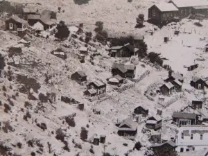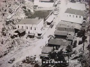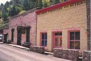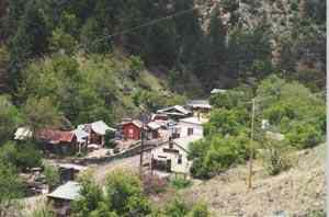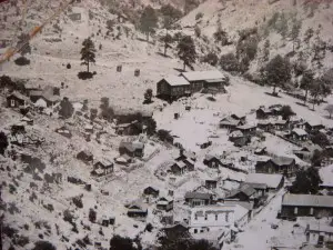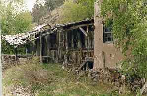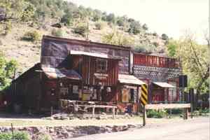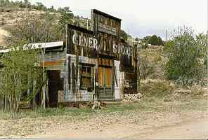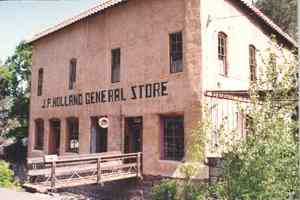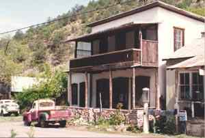 The mining camp at Mogollon was started during the 1890s in the bottom of Silver Creek Canyon. Several mines of some note were started with the one named Little Fanny gaining the reputation that is the history of the town itself. The presence of miner's consumption was so severe it was not uncommon for miners working the Little Fanny to last only three years or less. The ghastly toll of men working in the mine forced the owners to develop the method of spraying water under pressure from the jack-hammers in breaking the quartz for removal from the mine. As the dust was reduced, so was the patient load for the town's three doctors. The population of the town at the time Little Fanny was being developed was about 2,000 and that was in 1909. By 1915, the mine's payroll each month was between $50,000 and $75,000 with the mine's gold and silver bullion being shipped to Silver City by mule team. During World War I, trucks took over hauling the ore to Silver City but the end was in sight. As time progressed, the assay value of the ore began to drop to the point it was no longer profitable to continue operations. When the Little Fanny closed down, so did Mogollon. Submitted by Henry Chenoweth. ![]() Mogollon Town Courtesy Dolores Steele ![]() Mogollon General Storeo Courtesy Dolores Steele ![]() Left = tiny Saloon - Mercantile - Holland Store Courtesy Dolores Steele ![]() Church Courtesy Dolores Steele