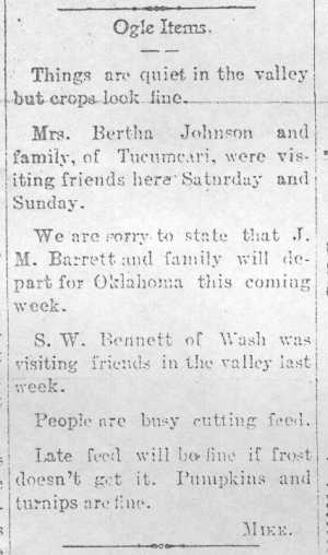 | Around the 1910's-1920's, my great-great-grandfather owned over 2100 acres on the outskirts of Ogle. They had a post office but beyond that, I do not have any further information on this community. The Ogle community had a column in the Montoya Republican newspaper around 1910. Would like to locate any old photos of this town if possible. Submitted by: Nathan Haley |