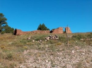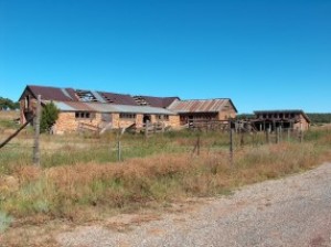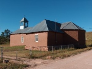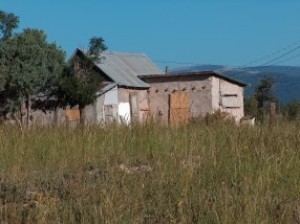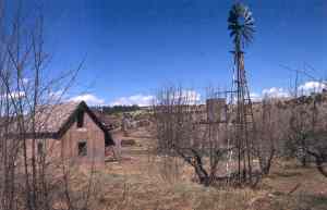 | The history of San Geronimo dates back to 1835. During the early years when settlers first arrived, Indian raids were common and forced the settlers to build their homes close together as fortress protection. About 1879, the Atchison, Topeka and Santa Fe railroad began laying track to the west and contracted with an Eugenio Romero to supply all the ties to be used. Romero built a sawmill and a new industry came to the town. A Catholic church was built in 1906 and a school was constructed in 1907. In 1937, the town had about forty families. Today, the population has dwindled to only a few families and the town looks much as it did fifty years ago. Courtesy Henry Chenoweth. |