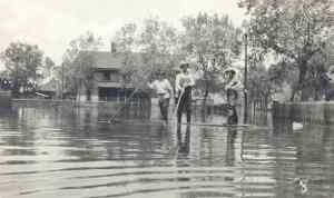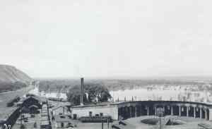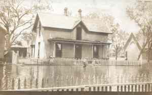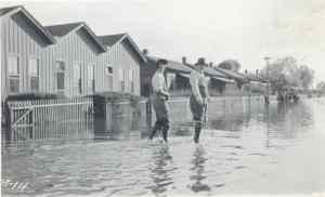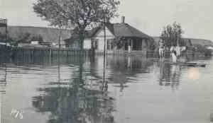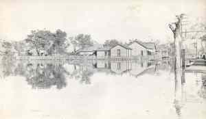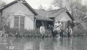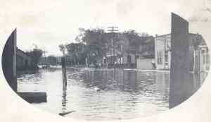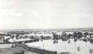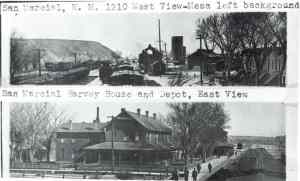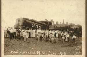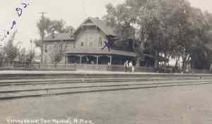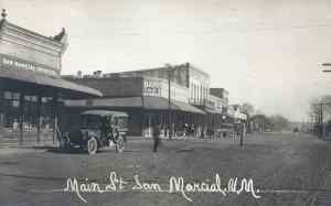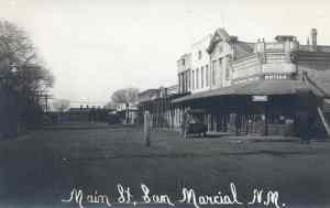 The original town of San Marcial had its beginning in the early 1850s on the east bank of the Rio Grande a few miles south of what was then Fort Conrad. In 1866, the town was wiped away by a flood. Fort Conrad had been relocated to the west bank of the Rio Grande a few years before the flood. That provided reason to rebuild San Marcial on the west bank and the people lost no time in re-establishing their community. No sooner had the new town began to grow than, in July of 1881, it was nearly totally destroyed by fire. Once again, the town was rebuilt and grew to a community of a thousand residents and became the center for agricultural and irrigation projects. By 1929 the population peaked at fourteen hundred. Then on the night of August 13, the waters of the mighty Rio Grande began to rise and soon reached flood stage. By the next morning the town was submerged up to the second floor of the buildings. Most of the residents, seeing their homes a total loss, left. The only visual evidence remaining today is a lonely cemetery hidden in the mesquite. Courtesy Henry Chenoweth.