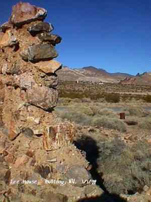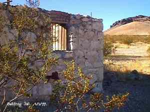 | The initial discoveries that resulted in the towns Bullfrog and Rhyolite occurred on August 4, 1904. The entire tent town of Amargosa City, which was located near the original Bullfrog mine, moved to the Bullfrog townsite in March 1905. In early 1905, Rhyolite began to form and soon there was fierce competition between the two towns. May of 1905 was the peak of Bullfrog’s short existence. Main street lots were selling for as much as $1,500. A two-story hotel was constructed in early 1905 along with a county jail. Other businesses included a three-story hotel, a lodging house, a general store, a bank, and an icehouse among others. A number of fatal gunfights did not help Bullfrog to keep its residents. Many left to live in Rhyolite and by 1907 Bullfrog was nearly empty. By May, the last business in Bullfrog had left for Rhylolite. Bullfrog’s last status symbol, its now vacant hotel, burned to the ground on June 25, 1906. The post office struggled to stay open during the next several years but closed its doors for good on May 15, 1909. Bullfrog joined the growing ranks of Nye County ghost towns. Today Bullfrog is almost totally flattened. The only visible remains are those of the old icehouse. If you stop at Bullfrog, be sure you visit the Bullfrog-Rhyolite cemetery located just south of the Bullfrog townsite. Submitted by: Shawn Hall from his book Preserving The Glory Days: Ghost Towns And Mining Camps Of Nye County, Nevada Click here to purchase his book! ![]() Bullfrog Stock Courtesy Steve Bruce ![]() Bullfrog Jail. January 1, 1999. Courtesy David A. Wright |
