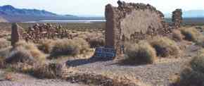 on the way as one drives from Beatty to Rhyolite. REMAINS: 1920's cars decaying in the brush; Ruins of buildings/foundations. |