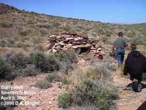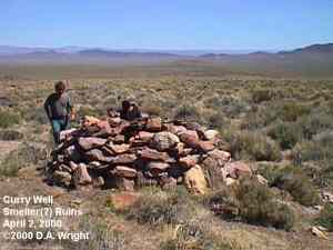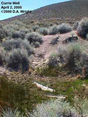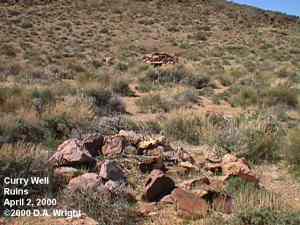 | A water stop along the Las Vegas & Tonopah Railroad. Located north of Mud Springs Summit at the southern edge of Sarcobatus Flat. Currie Well was an important water stop as southbound trains coming from Goldfield made their final climb over the Bullfrog Hills. Water source is a pungent, stagnate and mushy wet spot with a bit of grass. Scattered stone ruins within a hundred yard radius indicate some habitation. Submitted by: David A. Wright |