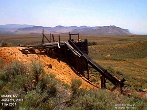 Originally called Rosebud then Gold Circle then Midas, the town was to become one of two biggest twentieth-century gold towns in Elko County. The first gold ore was discovered in July 1907. Initial assays ran between $2,400 and $20,000 per ton. A townsite was laid out in November and lots selling for $100 to $200 went quickly. The post office opened during November of 1907 and the Elko-Tuscarora stage line immediately extended a branch to the townsite. By the beginning of 1908 the town supported a doctor, several saloons, two restaurants, a store, two feeding stables, and four real estate offices. By the end of April, the population of Midas was estimated at 1,100. By the end of summer five hotels had been built. But due to the absence of mills nearby and the cost of shipping the ore a considerable distance, only the richest ore could be shipped and as a result many miners left town. By the end of the year only 250 residents remained. However, by the end of 1910 the mill problem had been addressed with the building of several mills and the population held steady around 200. While the mines produced every year from 1908 to 1941, the amount varied dramatically and all operations were shut down early in 1941. There is much to see at Midas but please respect the fact the town is now on private property. Midas was a small mining camp that existed from the 1880s to around the turn of the century. There were never more than fifty people at Midas and only a couple of frame buildings were ever built there. Mining was never profitable enough to support the residents and the site was abandoned with little notice to or by anybody. Today, only scattered rubble marks the spot.