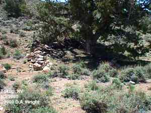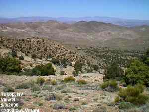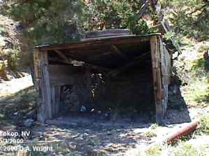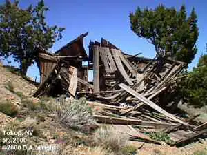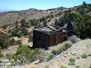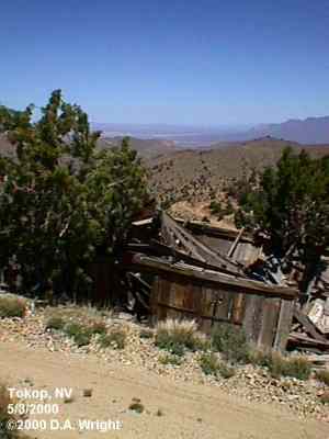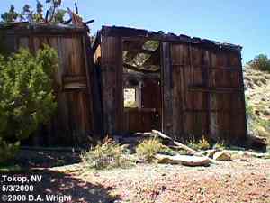 | Tokop was a minor community in the desert region at the extreme northern Death Valley region, a sparsely settled countryside punctuated then by only dying Stateline and Oriental. Sporadic mining began in the 1890s. A stage station was established early in the first decade of 1900. As more prospectors scoured the countryside lured on by the booms of nearby Goldfield and later Rhyolite, men found large quantities of low grade gold ore on top of this wind swept mountain. However, no ore was mined in sufficient quantities to warrant a town to be built. Today only fallen ruins of rotting lumber shacks dot the top of Tokop. Submitted by: David A. Wright |