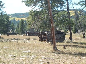 When I was a young child, I lived here. This was our and anothers families quarters, here was for the horses, this was the commisary, this was the dynamite shed, etc. (I wished I had taken notes) this was the central re-supply point for all the tie hacks in the area. The tie hacks cut trees and made the basics of rail road ties. They would haul the trees in winter because it was easy to skid to a central location where we could later load wagons. When the water flume became available, that was the haul location (the flume is to the west and took logs to the rail, some portions can still be seen) he went on to say that the forest there was primarily doug fir and that they cut all the big trees leaving only the lodgepole pine. They would take a team and wagon or sled depending on snow depth and general conditions about once a month in winter to evanston to re-supply.
