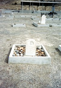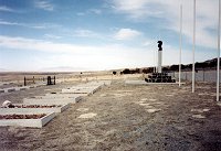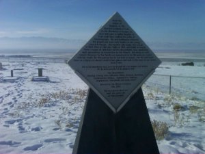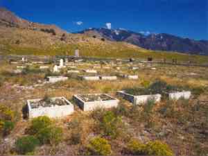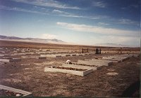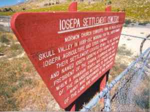 Just south of the Salt Lake. REMAINS: The Church has dedicated it as an historical site and surrounded the grave sites with a chain-link fence. The graves themselves have been surrounded with cement curbs. There is a Monument and a plaque with all the names on them and a brief history. It is on the hillside and accessible from a dirt road off the main highway between two of the last remaining residents still being used. On the road to the graveyard are a couple of foundations. We looked around and could see rocks outlying some sort of places where the houses had been as well. Also, an old curb with a row of trees on what looks like a main street can be seen. We found some old glass that looked like it had been window-pane glass. But nothing else is left of the town - Maida Murphy. |